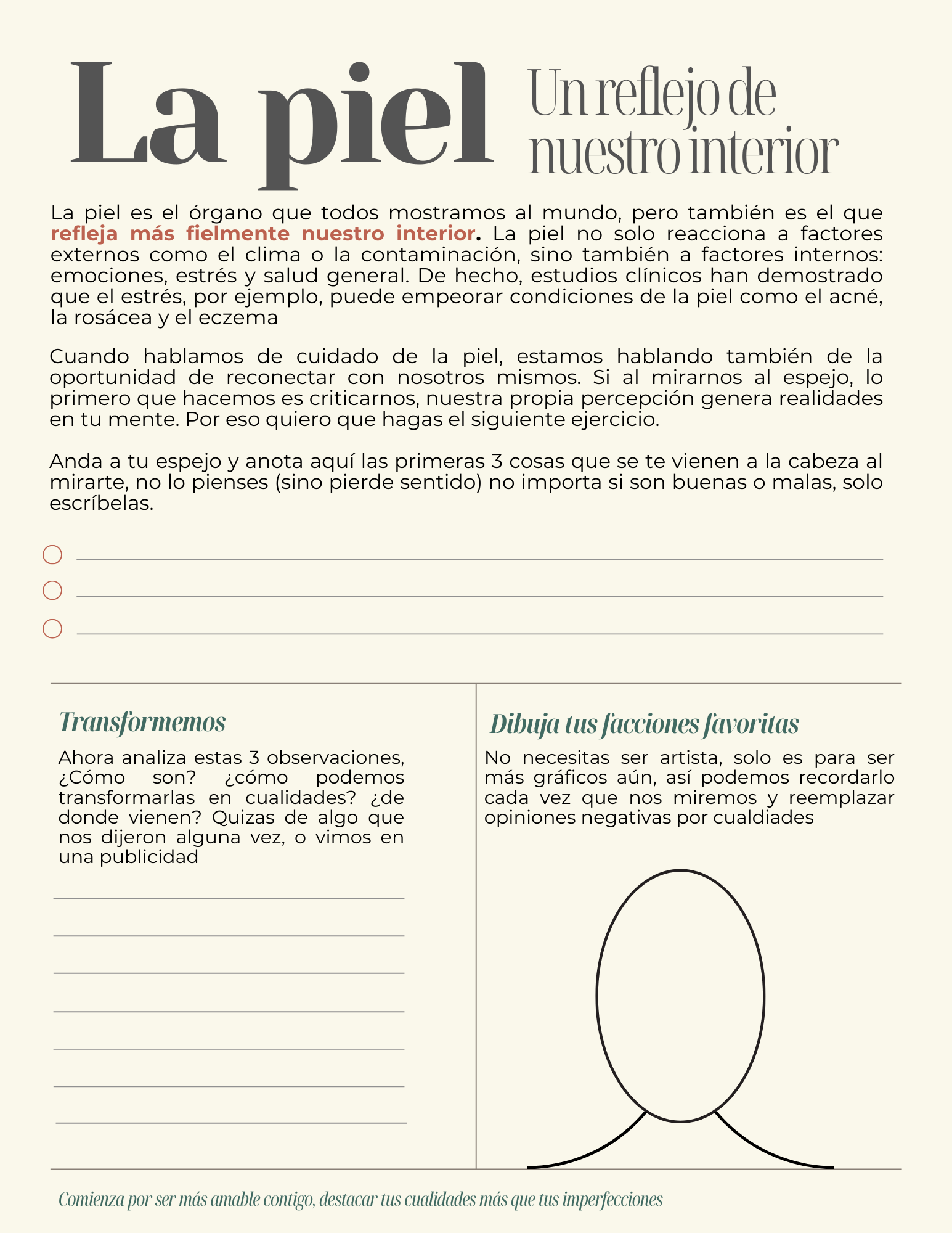 ✨ Herramientas para el Cambio: Incluye ejercicios guiados para transformar tu relación con tu piel, potenciando el autocuidado desde el amor propio.